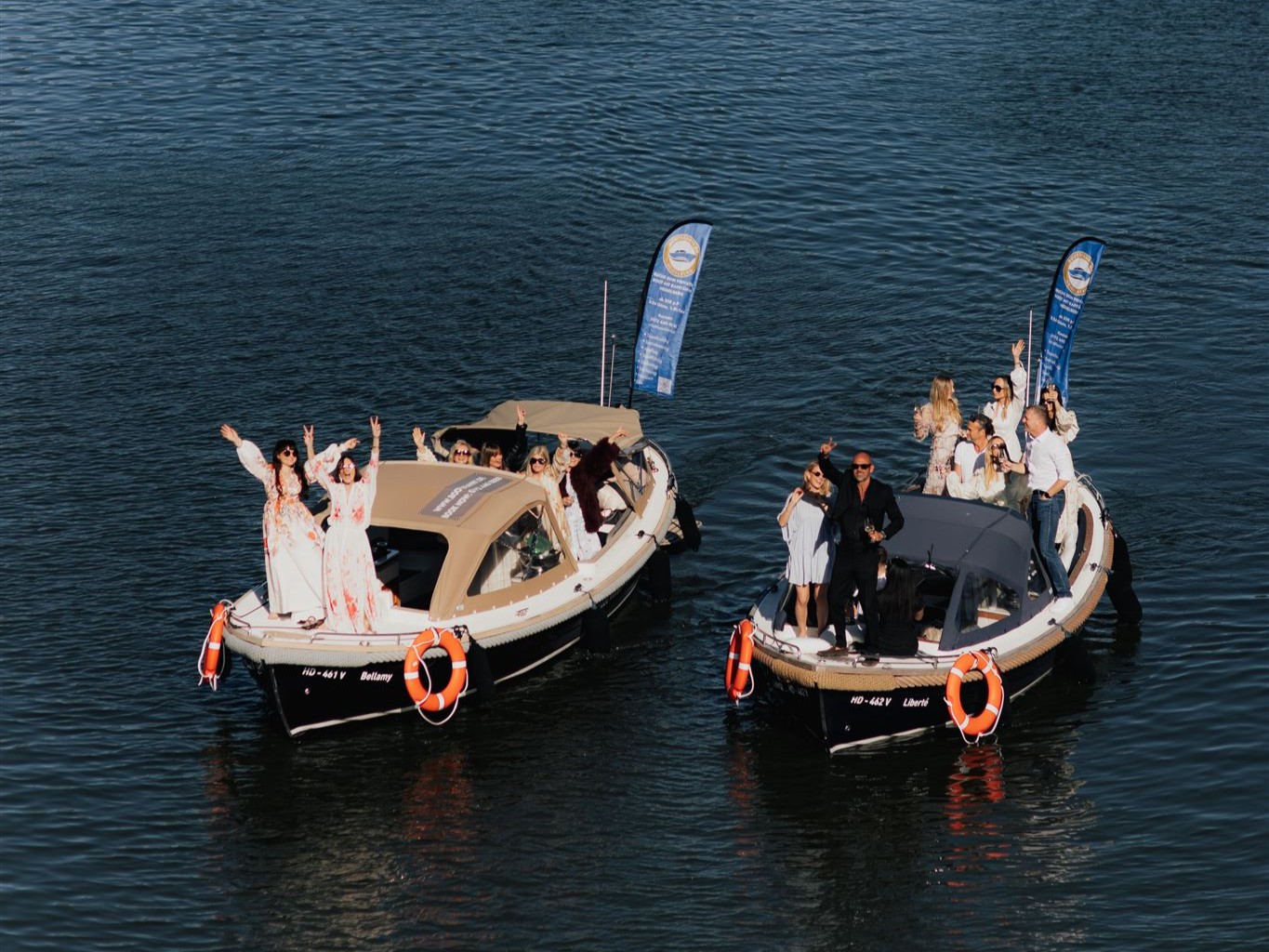 Unsere Flotte umfasst drei hochwertige Boote, die Platz für jeweils 12 Personen bieten. Du möchtest mit einer größeren Gruppe feiern? Kein Problem! Die Boote können zeitgleich gemietet werden, sodass du mit bis zu 36 Gästen an Bord feiern kannst. Die Boote werden auf dem Wasser verbunden und fahren dann wie ein großes Boot, die Partygäste können zwischen den Booten wechseln – tanzen, feiern und genießen inklusive.