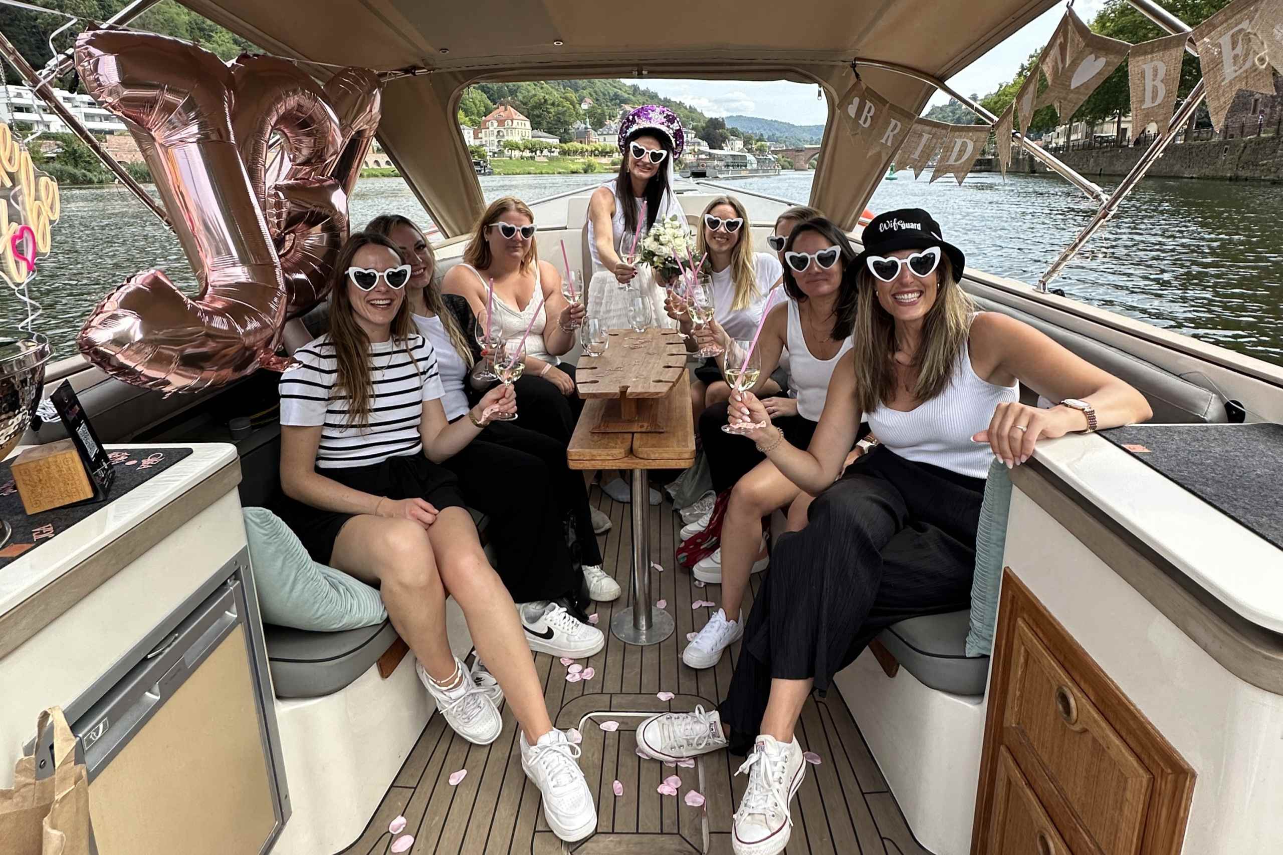 Wenn du einen außergewöhnlichen JGA in Heidelberg planst, sind unsere Partyboote die perfekte Wahl. Hier kannst du mit deinen Freundinnen eine unvergessliche Zeit auf dem Neckar erleben – stilvoll, exklusiv und komplett unter euch. Feiert mit einem Glas Wein am schönsten Fleck in ganz Heidelberg, legt eure Lieblingssongs auf, feiert ausgelassen und genießt die einzigartige Atmosphäre. Ihr könnt außerdem eure eigenen Getränke, coole Party-Accessoires, Deko und Snacks selbst mitbringen. Damit ihr garantiert nicht auf dem Trockenen sitzt, könnt ihr auch noch weitere Getränke über uns dazubuchen.